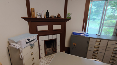 ヴォーリズが作る住居ですから、やっぱり暖炉があります。ただ、ちょっとチープな感じですかね。予算の関係でしょうか。まわりの事務用品がちょっと興ざめですが、今は市民活動の拠点として活用されていますのでね、受け入れましょう。