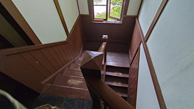 階段です。ヴォーリズ建築の特徴である段差の緩い階段はここにもあります。装飾は質素ですけどね。