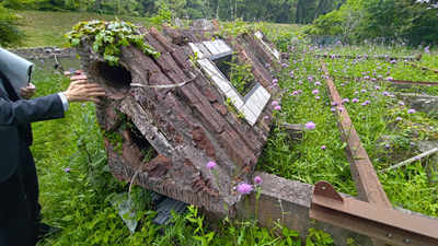 地震で1棟壊れたそうで、その後が残っていました。で、見ることができたのが煙突。こんな断面でした。