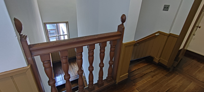 階段です。ヴォーリズ建築の特徴である段差の緩い階段はここにもあります。装飾は質素ですけどね。