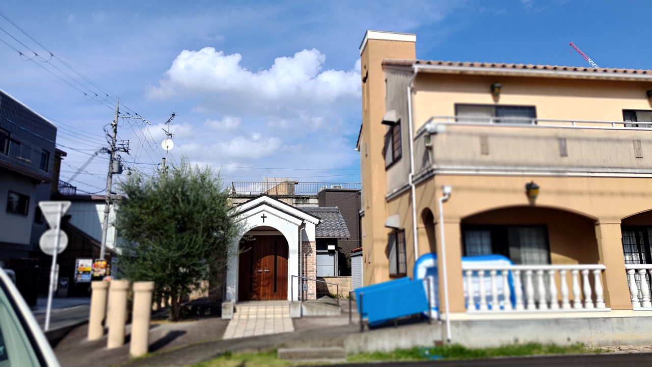 ところでこの近江金田教会ですが、横から見ると結構長いです。左の薄茶の建物はこども園か何かかなぁ。私が写真を撮っている時も、小学生とおぼしきこどもたちが入っていきました。バリバリの現役です。