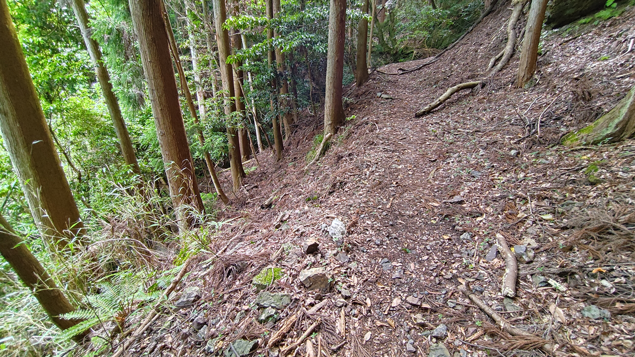 右に延びているのが善峯寺に行く山道ですが、左に谷に降りていくような道が見えませんかね。これ、道と呼べるものではないのですが、人が歩いた感じがあって、これを伝って下に降りられます。一の滝、二の滝へはここから行きます。